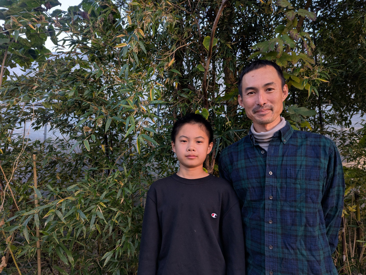 黒竹の花を発見した鶴渕統仁君と父親の真一さん