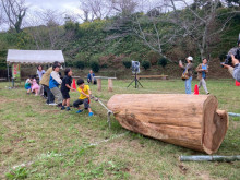会場では、共催者で移住者のグループ「C&A企画」が中心となり、「丸太引き」や町内で定期的に行われている「季のマルシェ」を同時開催。キッチンカーや飲食店などが出店したほか、町特産品のレンコンも販売した。同会は「里山の恵みがふんだんに味わえる」飲食ブースを設け、ぼたん汁の販売やイノシシのバンザイ焼きのを振る舞いを行った。