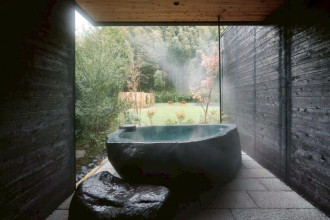 今回新設した露天風呂は、約300キロの天然石を一つ一つ職人がくりぬいて作り上げた。床は御影石、壁は焼き杉をあしらい、自然素材で構成された空間に仕上げた。