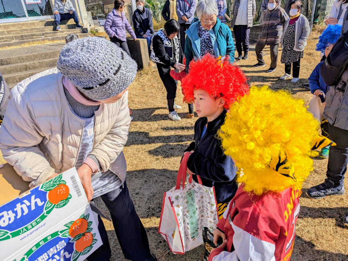 御宿町の子育て世代を中心としたボランティアグループ「かぐやdeアミーゴ」が2月1日、「節分の日子ども鬼の豆まき訪問」を行った。