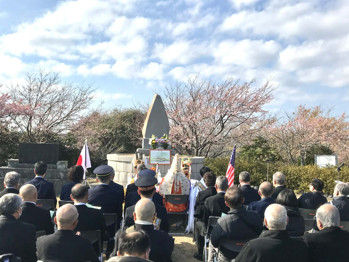 勝浦市川津沖で座礁沈没した蒸気船「ハーマン号」の慰霊祭が2月13日、官軍塚公園慰霊碑前(勝浦市川津)で執り行われた。