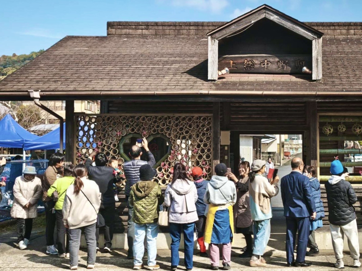 上総中野駅のオブジェの前でにぎわう人々(写真提供=kiccake)