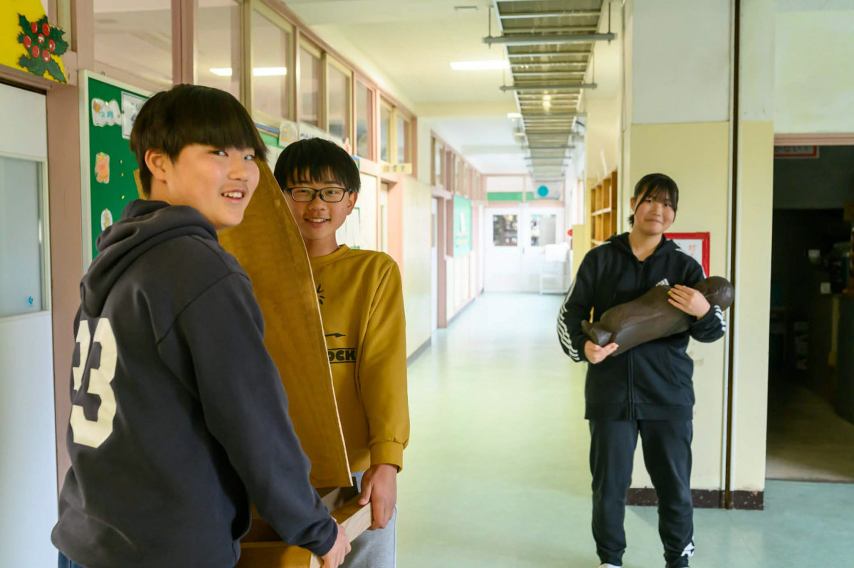 仏像を大事に抱えて運ぶ6年生の児童(画像提供=吉村直繁)