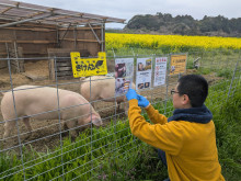 ホエイ豚の取り組みについて多くの人に知ってもらいたいと看板を設置した
