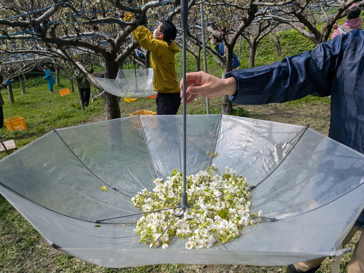 いすみの社会福祉法人「土穂会」が運営するピア宮敷第1工房(いすみ市岬町桑田)で4月3日、花粉作りに向けた梨の花の収穫作業が行われた。