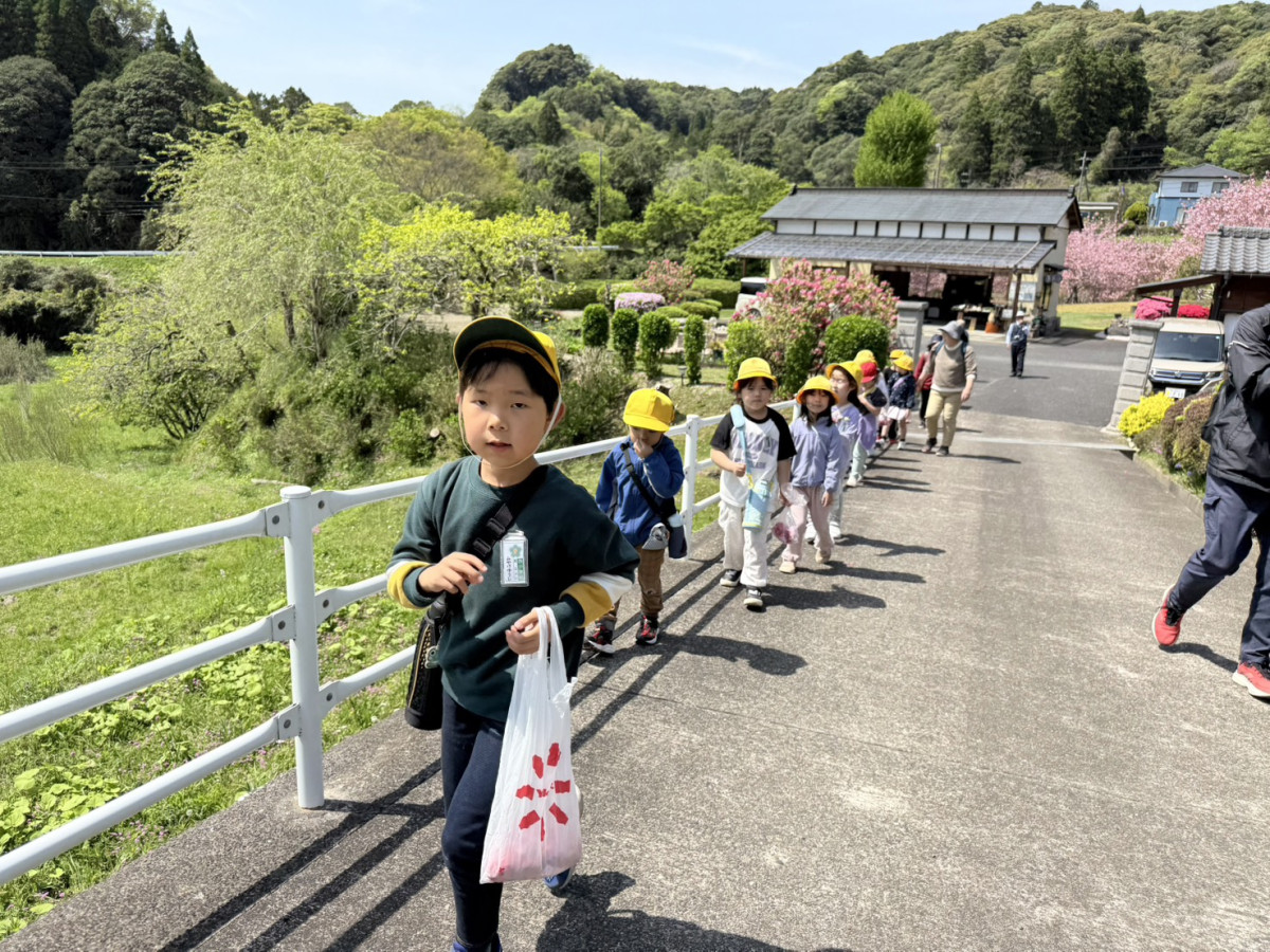 土産に花を持ち学校へ戻る児童ら(写真提供=Yellow)