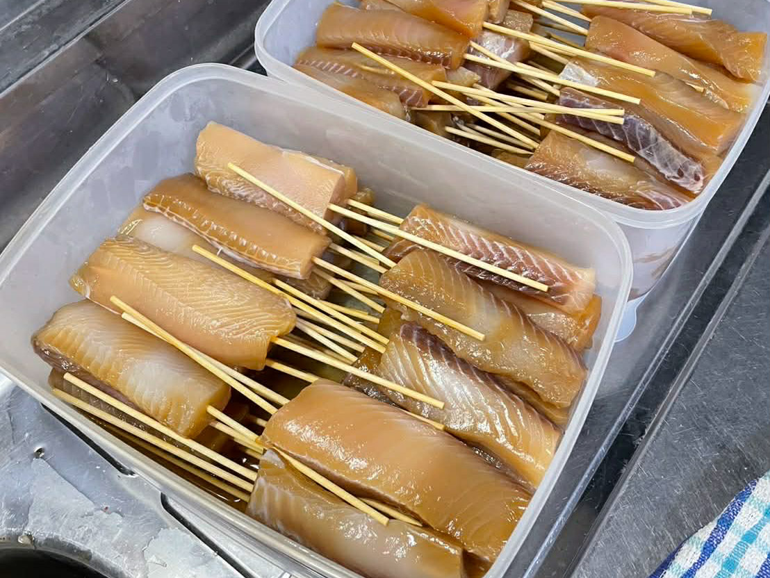 オリジナルのたれに漬けた「シャークバー」。炭火で焼いて提供する