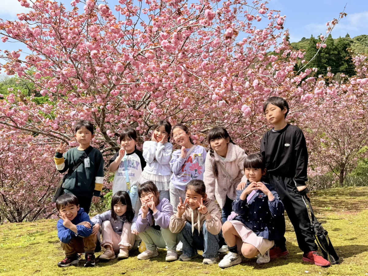 大多喜町立西小学校の1、2年生。桜の前で記念撮影(写真提供=Yellow)