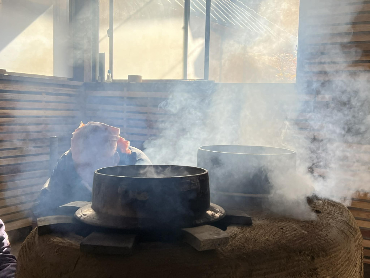 土間にあるかまどは自分たちの手で作った。かまど炊きご飯も予約制で味わえる